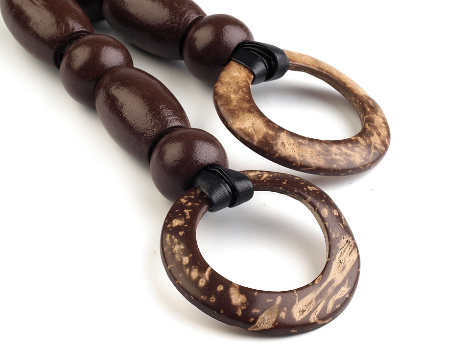 The handle consists of wooden beads connected by faux leather braiding, with wooden rings at both ends.